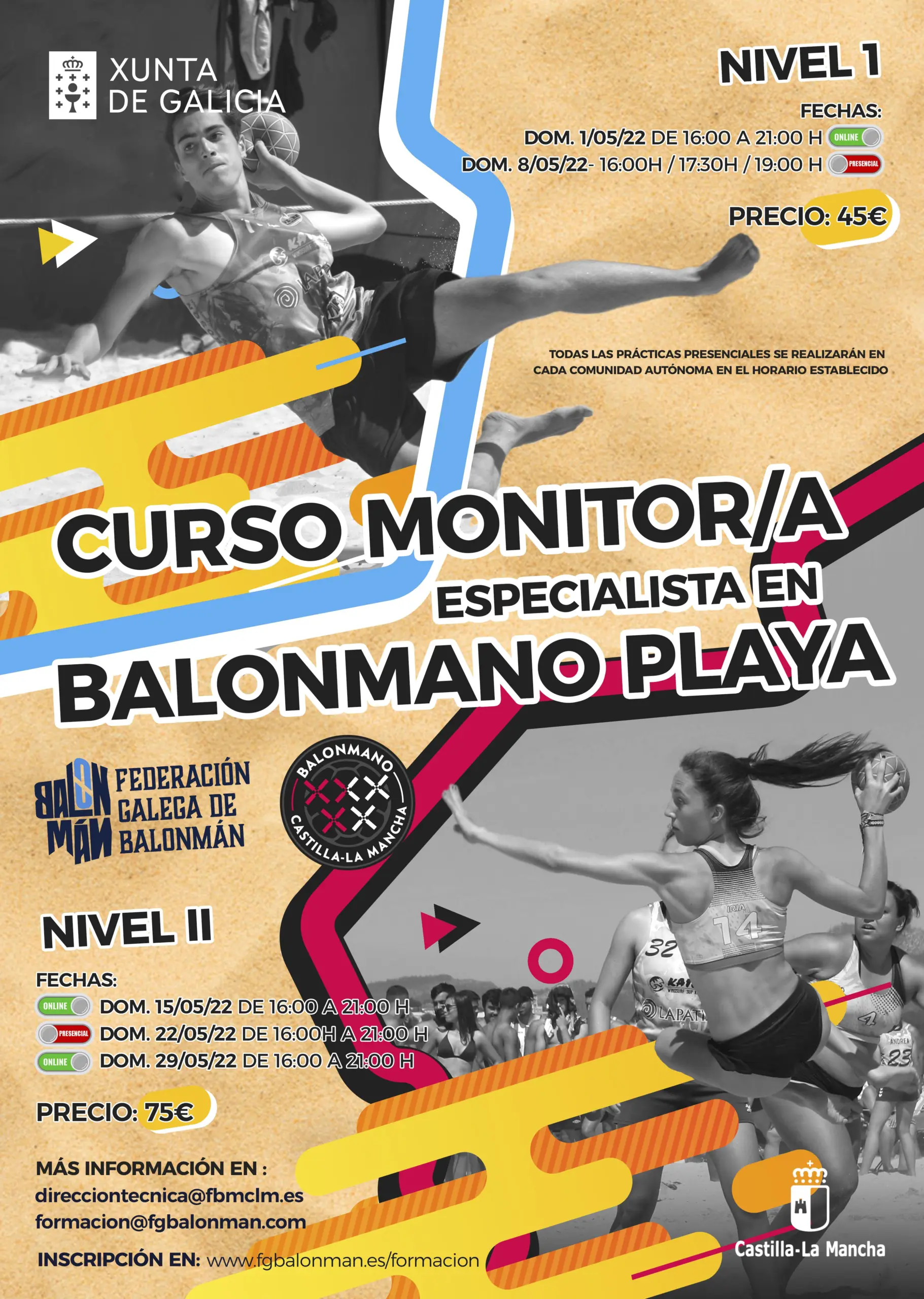 O segundo curso será o de adestrador/a especialista en Balonmán Praia nivel II e o prazo de inscrición rematará o día 14 de maio. Neste caso a formación realizarase os domingos 15, 22 e 29 de maio e tamén haberá tanto clases presenciais como online.