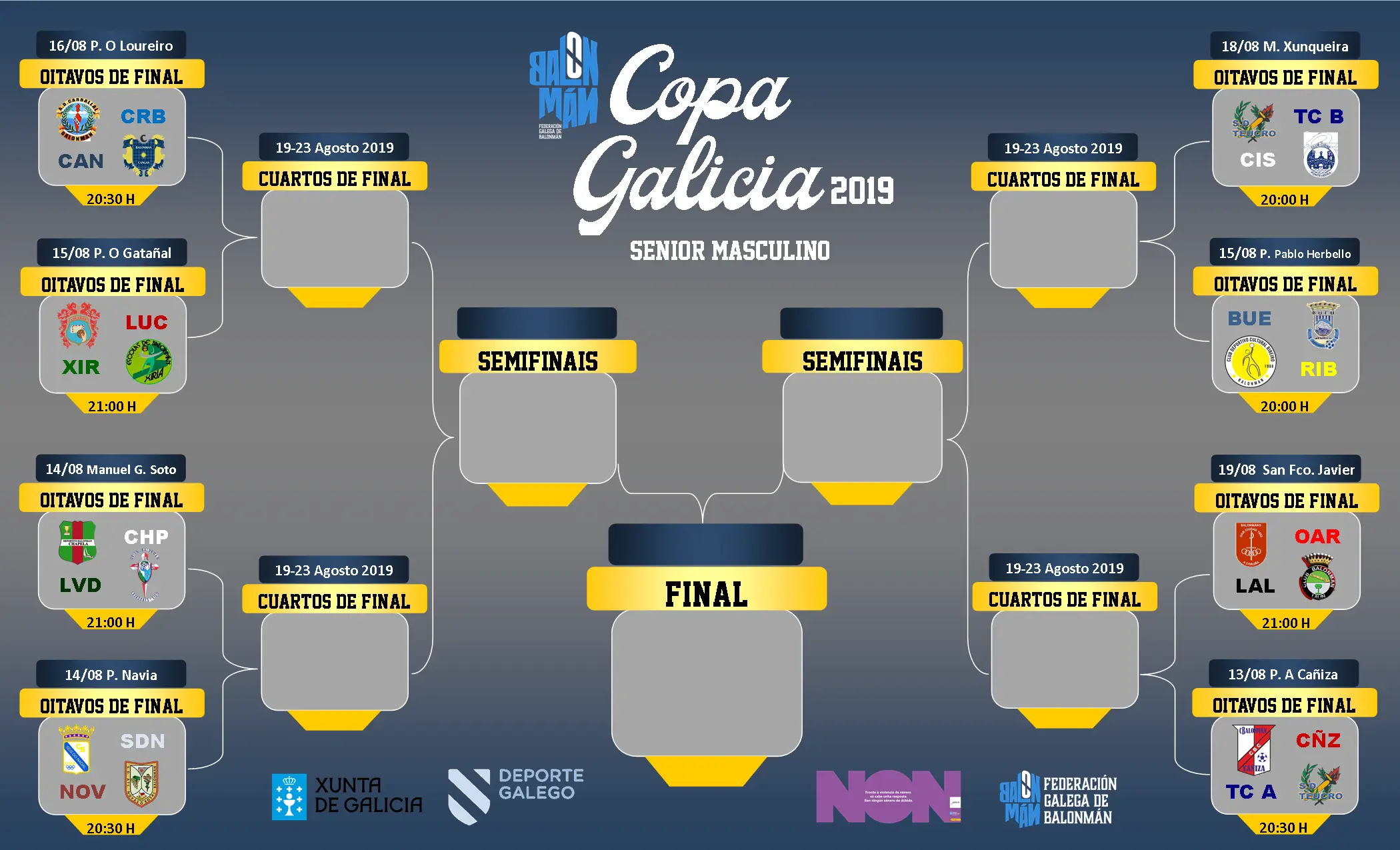A Copa Galicia masculina 2019 comeza hoxe 13 de agosto (20:30 horas) coa disputa na Cañiza do primeiro partido dos oitavos de final, que enfrontará ao BM Cañiza co Condes de Albarei Teucro.