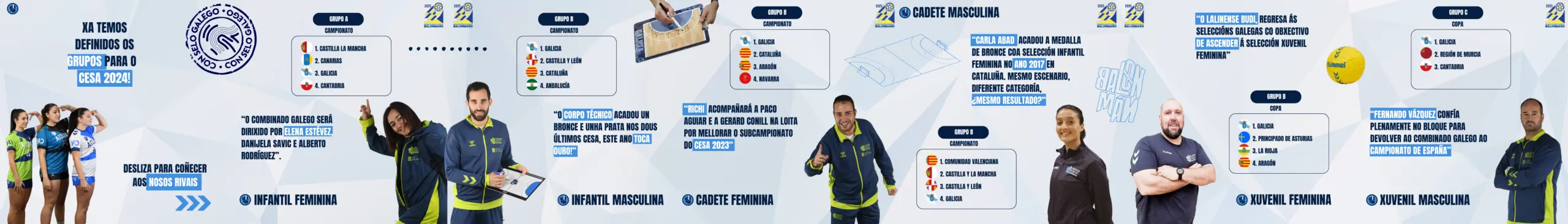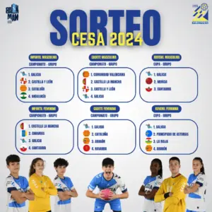 As seleccións galegas xa coñecen aos seus rivais de cara ao CESA 2024. O mércores ás doce da mañá, na sede da Real Federación Española de Balonmano, en Madrid, tivo lugar o sorteo que determinou cal será o camiño a percorrer polos diferentes combinados de cara ao Campionato de España de Selecciones Autonómicas que terá lugar do 2 ao 7 de xaneiro en Cataluña.