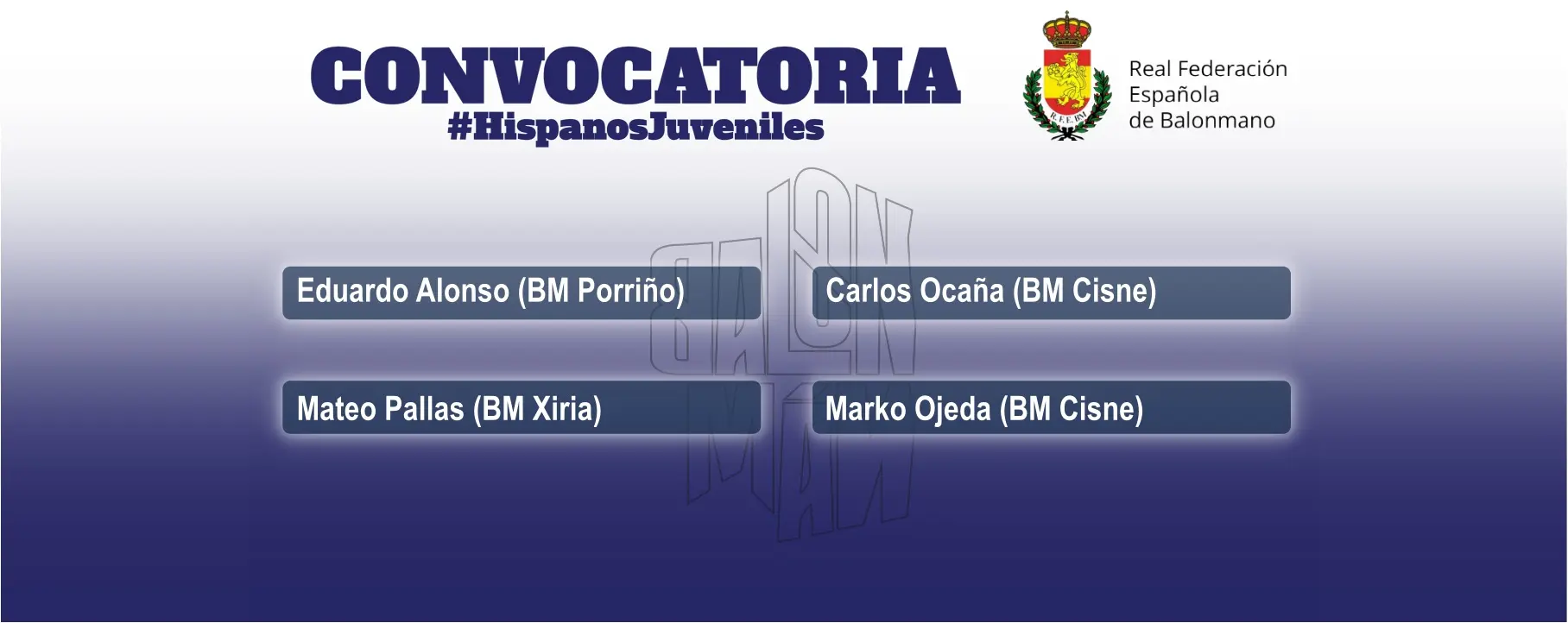 A actividade das seleccións nacionais non paran e temos unha nova cita para os Hispanos Xuvenís na que, por suposto, teremos representación galega. Os xogadores citados son Eduardo Alonso (BM Porriño), Mateo Pallas (BM Xiria), Carlos Ocaña (BM Cisne) e Marko Ojeda (BM Cisne), e ademais teremos como seleccionador a Javier Fernández, Jabato, e como integrante do corpo técnico a Carla Abad.