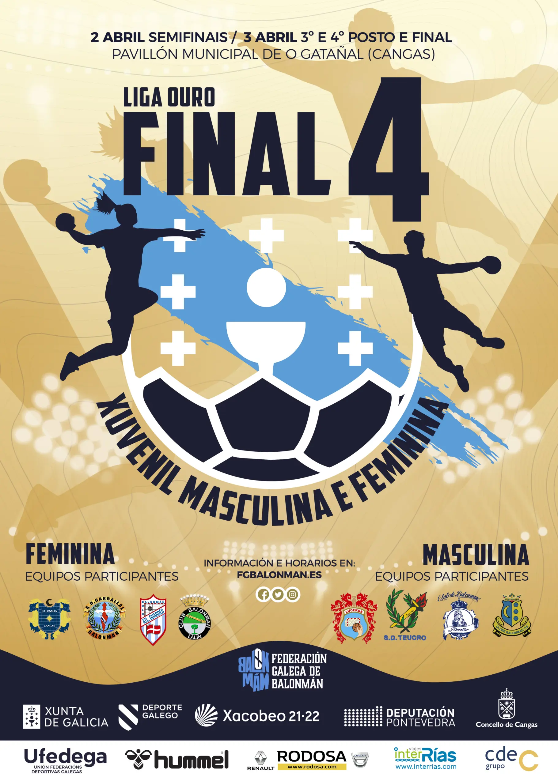 Chegou por fin a primeira Final Four da tempada 21/22! Esta fin de semana (2 e 3 de abril) xogarase no Gatañal (Cangas) a Final Four xuvenil masculina e feminina. En xogo, a clasificación para os sectores nacionais, así que temos por diante dúas xornadas de moito balonmán e emoción.