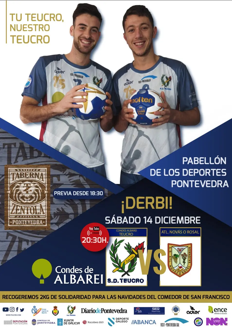 Condes de Albarei Teucro – Acanor Atlético Novás. Partidazo no Municipal de Pontevedra antes do parón do Nadal (sábado 14, 20:30 horas) na División de Honra Prata masculina. Derbi, rivalidade e emocións. Volve Quique Domínguez á que foi a súa casa durante moito tempo, de xogador e adestrador. O Teucro enfronta o choque despois dunha dura derrota da semana pasada en Bordils e o Novás reforzado pola vitoria contra o Torrelavega. O ambiente nas gradas está asegurado, coa viaxe da afición do Rosal. Ademais o partido terá un carácter solidario, xa que se realizará unha recollida de alimentos que serán destinados ó Comedor de San Francisco para este Nadal.