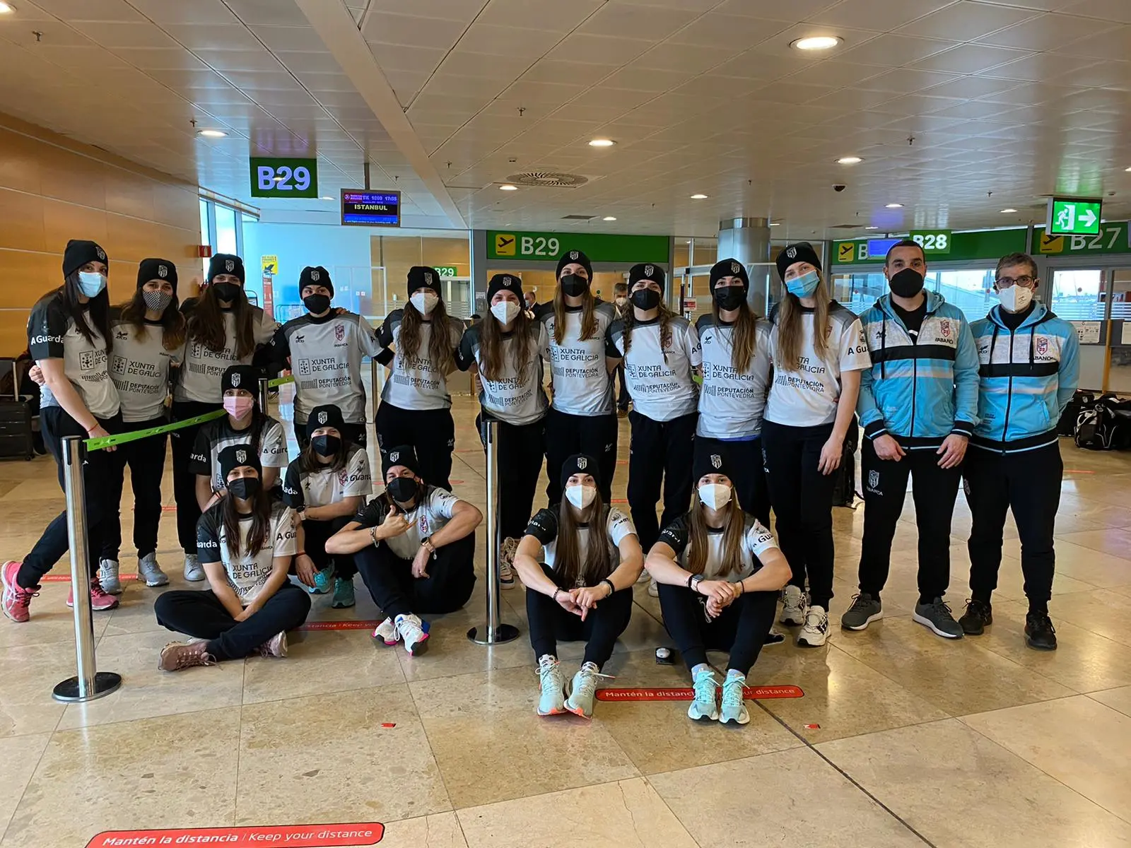 Tocou facer escala en Madrid e ás seis da tarde poñer rumbo a Istambul. Tras facer noite na capital turca, xogadoras, corpo técnico e demais membros da expedición guardesa tiveron un pequeno revés na tarde de onte. Xa no aeroporto turco recibiron a notificación de que o voo que debía levalos a Ucraína fora cancelado debido ao mal tempo no aeroporto de destino.