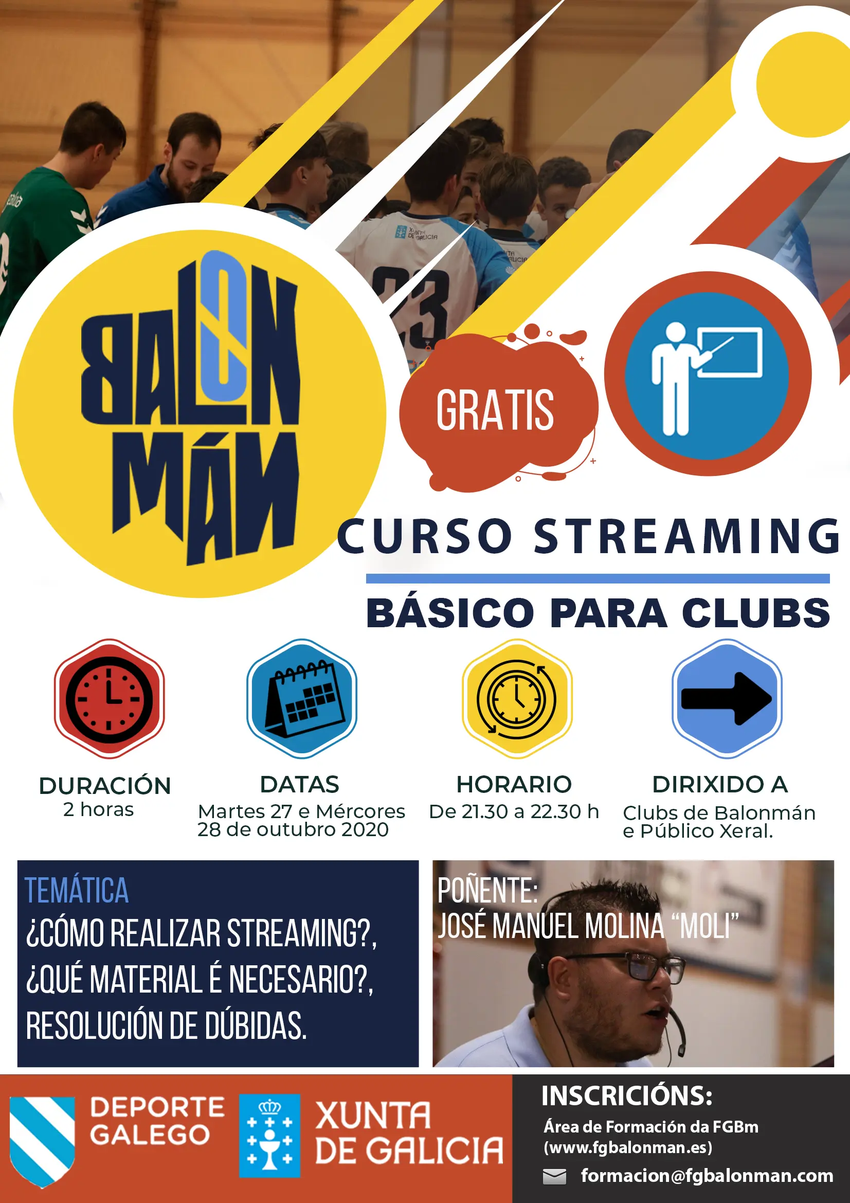A Federación Galega de Balonmán pon en marcha un curso de streaming para o balonmán galego. A situación que estamos a vivir a raíz da pandemia provocada pola Covid-19 conlevou importantes restricións, moitas delas afectando aos aforos das instalacións deportivas. Os clubs, a propia federación e as e os deportistas deben reinventarse para seguir chegando á masa social e dar visibilidade ao noso deporte dun xeito asumible e práctico e por iso parécenos moi interesante esta formación sobre streaming para os nosos clubs.