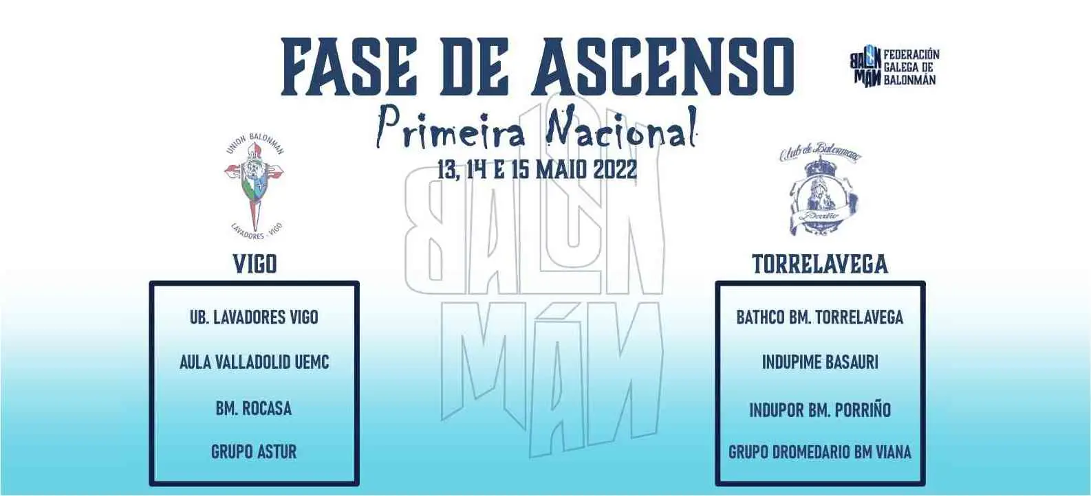 Xa se coñecen como vaI ser a fase de ascenso a Primeira Nacional Masculina, que se celebrará os días 13, 14 e 15 de maio. UB Lavadores, campión galego, xogará o seu sector na casa, mentres que Indupor BM Porriño (subcampión) terá que desprazarse ata Torrelavega.